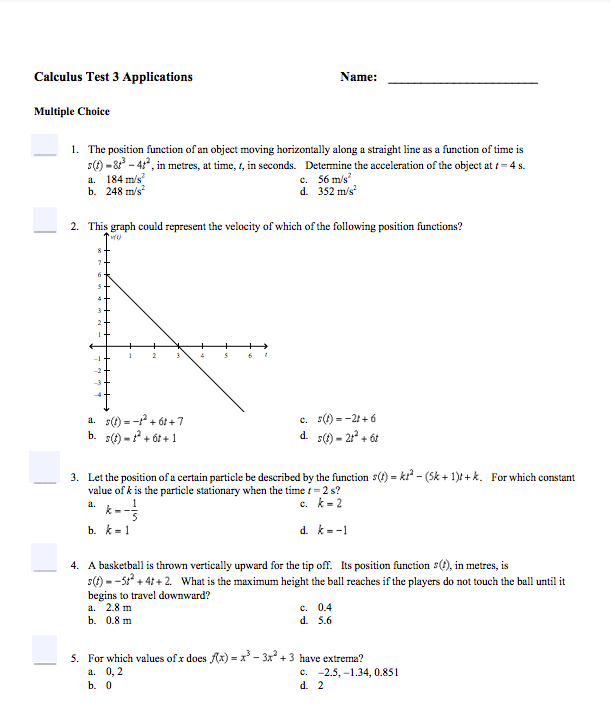 Solved Calculus Test 3 Applications Name Multiple Choice 1 Chegg Com
